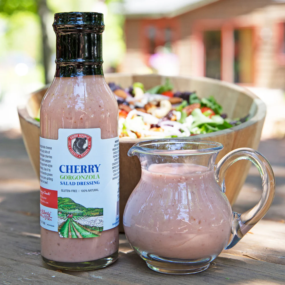 This gourmet-style dressing blends creamy Gorgonzola, real bits of Northern Michigan cherries, and ground black pepper. Perfect for drizzling over crisp greens—or use it as a marinade to give grilled meats a cherry twist.Â