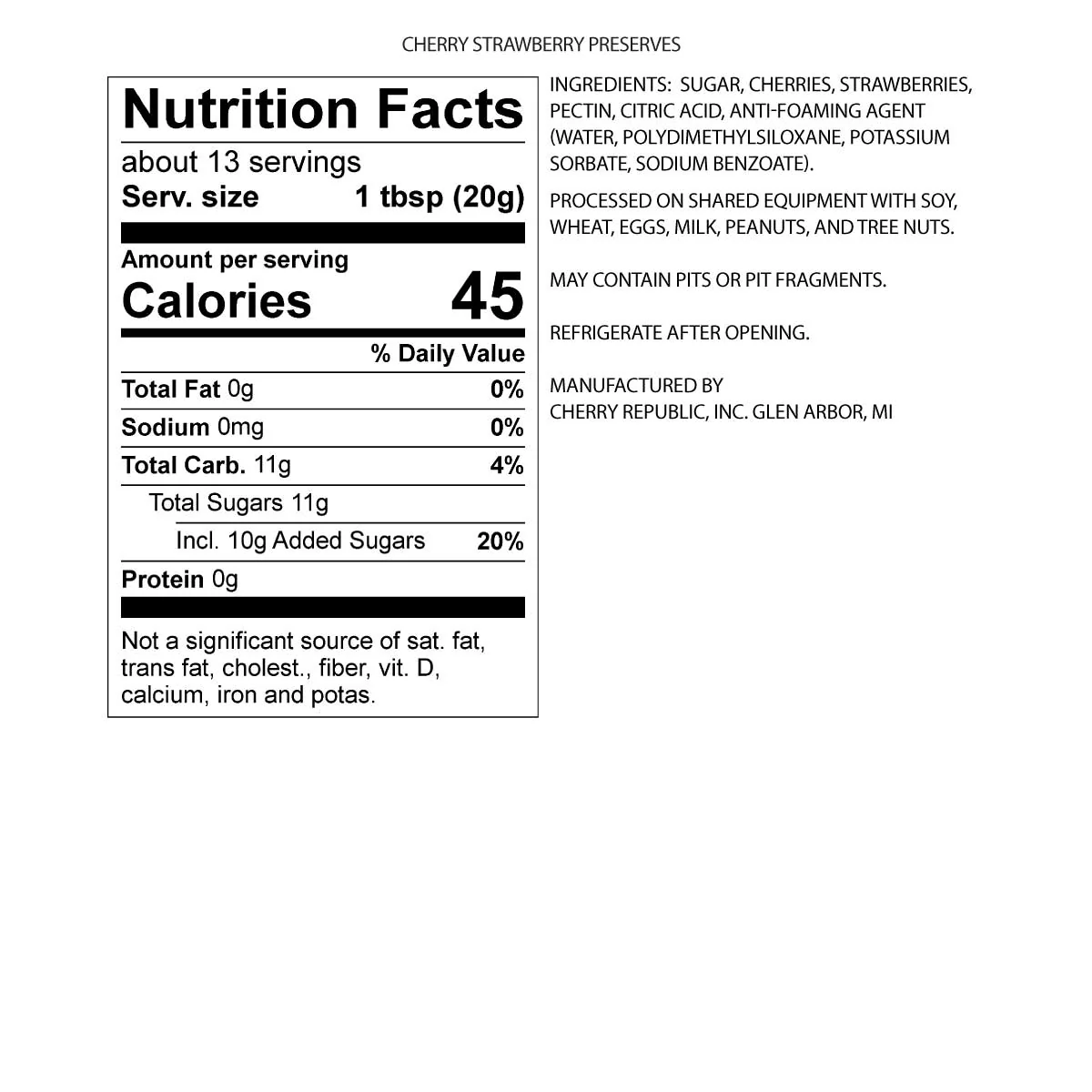 Enjoy our year-round Cherry Strawberry Jam, crafted with fresh Michigan cherries and strawberries. This jam brings a taste of summer to your table, no matter the season. With less sugar than traditional jams, it preserves the rich strawberry flavor while highlighting the tart cherries. A delicious low-sugar option!