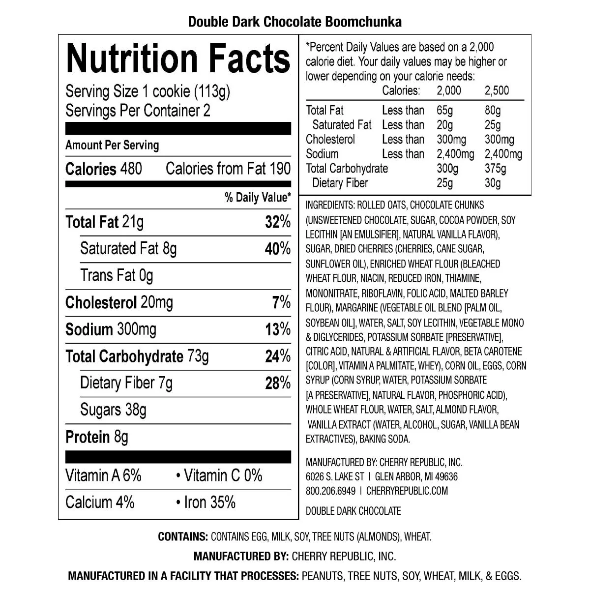 Calling all dark chocolate lovers! Looking for a rich and indulgent twist on our classic Boomchunka? Look no further! Our Double Dark Chocolate Boomchunka is packed with plump dried cherries and rolled oats, but it's the addition of delicious dark chocolate chunks that truly sets it apart. Whether you're a longtime Boomchunka lover or a newcomer to the Republic, the Double Dark Chocolate Boomchunka Cookie is sure to win you over after the first bite.