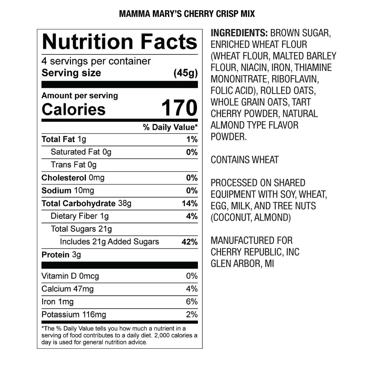 Create a heavenly crisp with our Cherry Crisp Mix, a blend of tart cherries, brown sugar, almonds, and oats. Simply add butter and sprinkle over Mamma Mary’s Top Secret Cherries for an irresistible crisp that tastes like home.Â