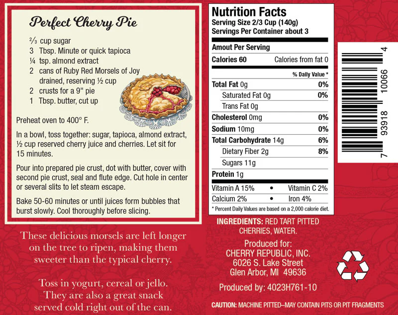Picked at the perfect point of ripeness and packed in their own juice and water, these ruby red superstars can be used in a variety of recipes! If you're looking to make the perfect cherry pie, we've even included the recipe on the back - two cans plus a few other key ingredients will make you a pie baking hero!